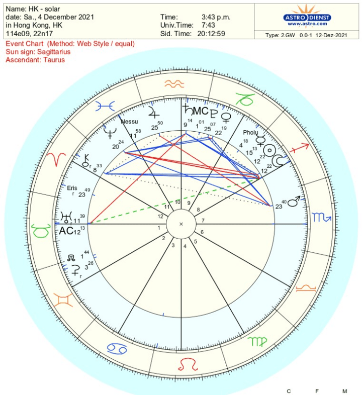 天秤六宮無星,司法判決為日常。主星金星與冥王星有相位,可預計斷續隻手遮天,公義亦會深埋地底。這不代表要放棄,火星天蠍七宮,有其他國家低調地關注此事。唐英傑案上訴為明年三月,如果時間接近月中,將會得到更多關注,包括中共。所以,上訴成功率會偏低,卻被國際社會狠狠記下。同時,天王星與八宮日月的相位,未來日子外匯、人口、教育、交通、商業、通信、公共安全、特首個人及其安全可能受到衝擊,而大部份應該自找或自製出來。沒有對應方法,只能硬生生接受。例如香港為了與鄰近地區通關,而必須安裝「港康碼」,到底是為了追蹤疫症源頭,還是另有目的,可能以醜聞、難看展現於公共,即使事實早已耳有所聞。