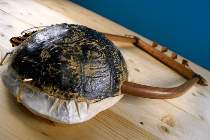 希臘著名的里拉琴 (lyre),又名為七弦琴,為古代希臘詩人必定攜帶的樂器。雖為太陽神波羅 (Apollo) 的象徵配件,卻由赫密斯所創造。黎明時分出生的赫密斯,尚未到正午已能從搖籃中爬出來。祂在山洞附近看見了一隻會唱歌的烏龜,心血來潮想做一件可彈奏的玩具。於是將烏龜殺死,淘空龜殼,拔取些蘆葦作量度工具並緊繫龜殼,再用七條羊腸線作為琴弦,然後慢慢逐一調音。赫密斯非常喜愛這玩具,更自彈自唱出父母之間的愛情故事。
